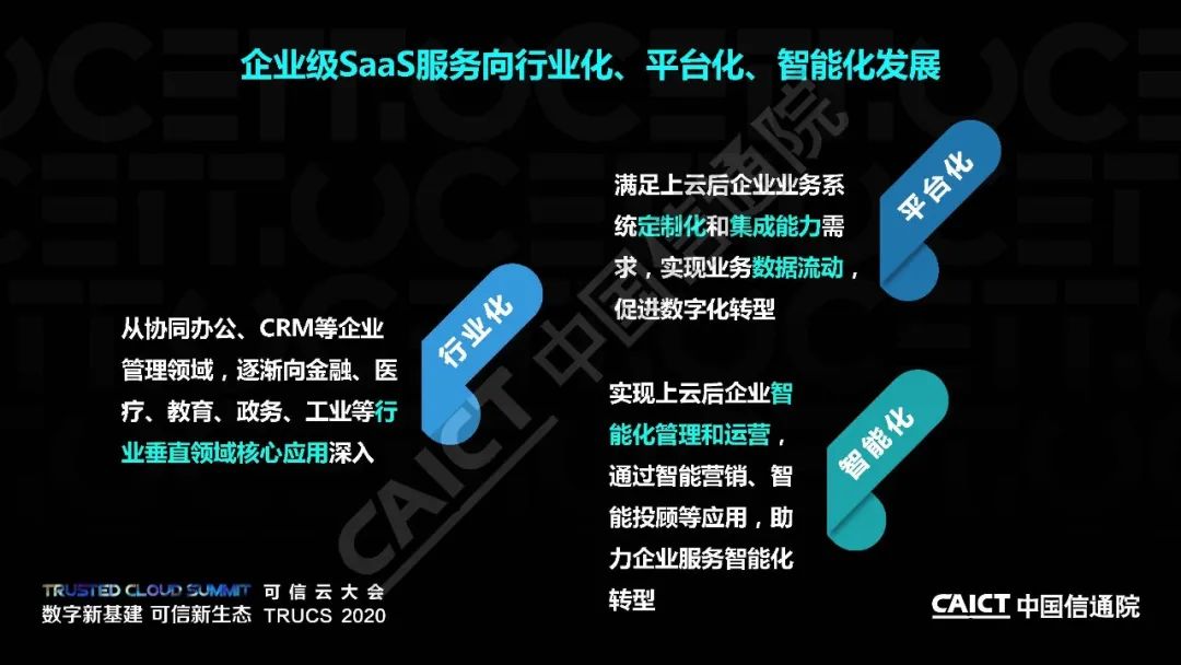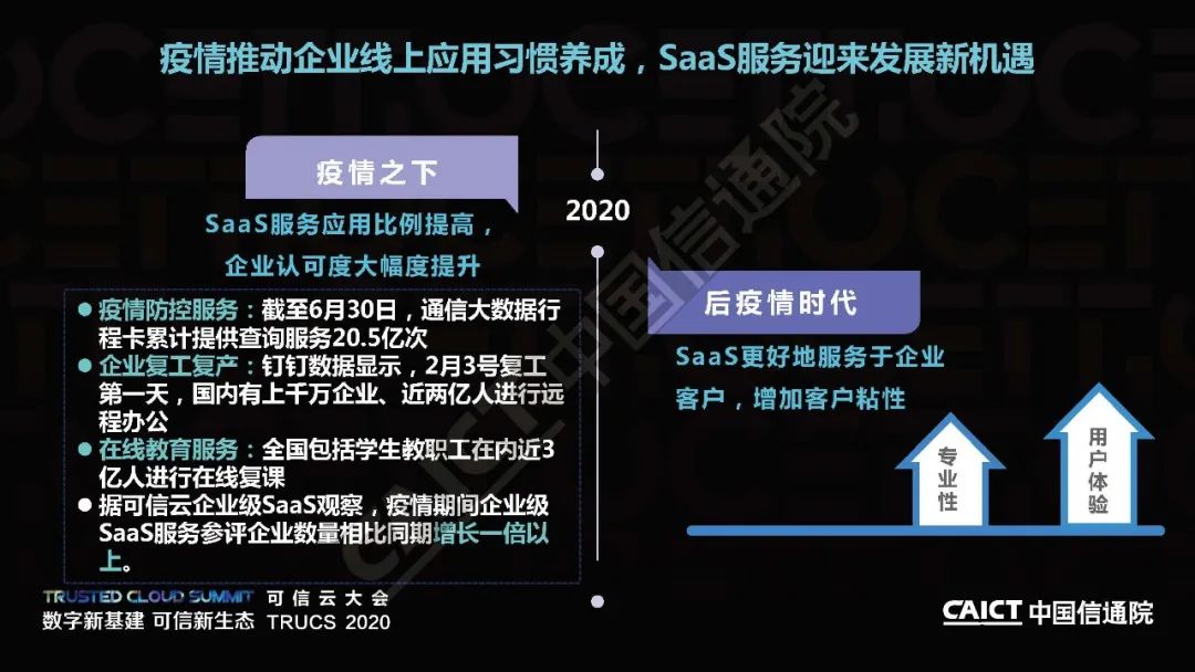 新冠肺炎疫情发生后,越来越多的企业养成了使用线上应用的习惯,比如疫情防控、在线教育,视频会议等都是SaaS服务,因而在后疫情时代,SaaS将通过增加客户粘性和专业性提升用使用率。“同时,SaaS、IaaS和ISV服务商三方将深度合作,形成优势互补,打通产业链上下游,共建繁荣、和谐的SaaS服务生态。”在栗蔚看来,“未来,企业级SaaS服务向行业化、平台化、智能化发展。”。