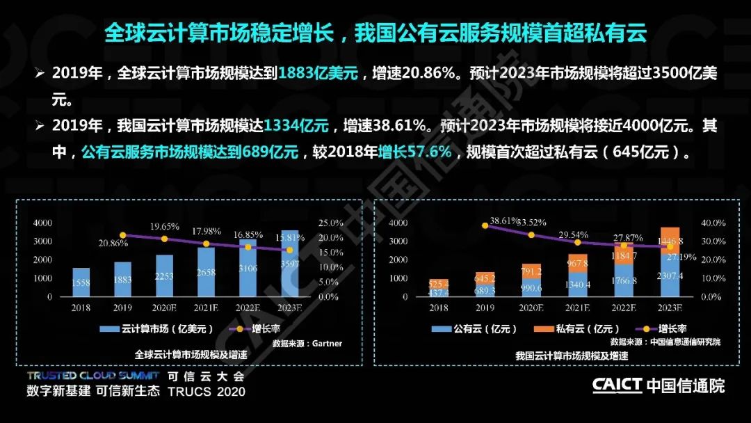 中国信通院统计显示,2019年,全球云计算市场规模达到1883亿美元,增速20.86%。预计2023年市场规模将超过3500亿美元。在我国,2019年云计算市场规模达1334亿元,增速38.61%。预计2023年市场规模将接近4000亿元。其中,公有云服务市场规模达到689亿元,较2018年增长57.6%,规模首次超过私有云(645亿元)。