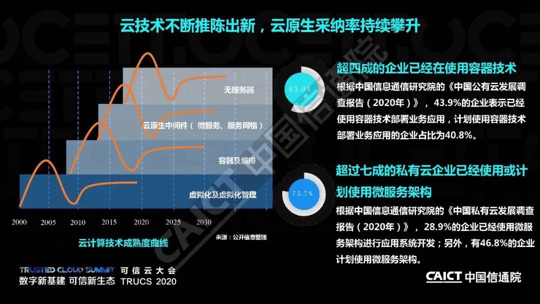 随着市场持续增长,云技术也不断推陈出新,其中一个值得高度关注的趋势是——云原生采纳率持续攀升。栗蔚介绍,目前超四成的企业已经在使用容器技术,超过七成的私有云企业已经使用或计划使用微服务架构。