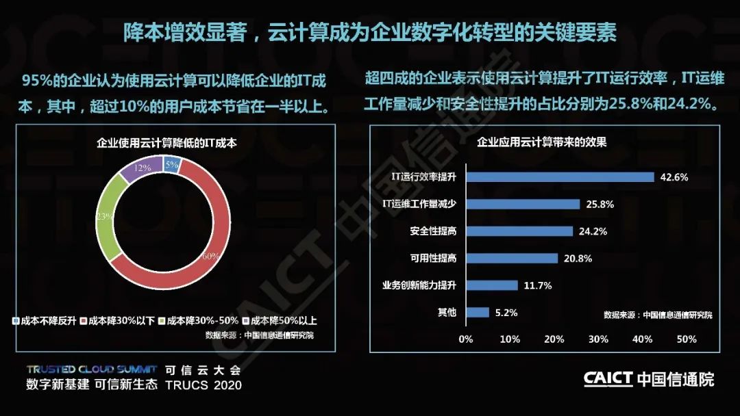 数字化转型已经成为经济社会发展的重要趋势。栗蔚指出,随着云计算技术、架构、安全等方面的推陈出新,云计算在数字化转型中扮演重要角色。调查显示,超过五成的企业使用云计算是为了降本增效,超四成的企业表示使用云计算提升了IT运行效率,IT运维工作量减少和安全性提升的占比分别为25.8%和24.2%。