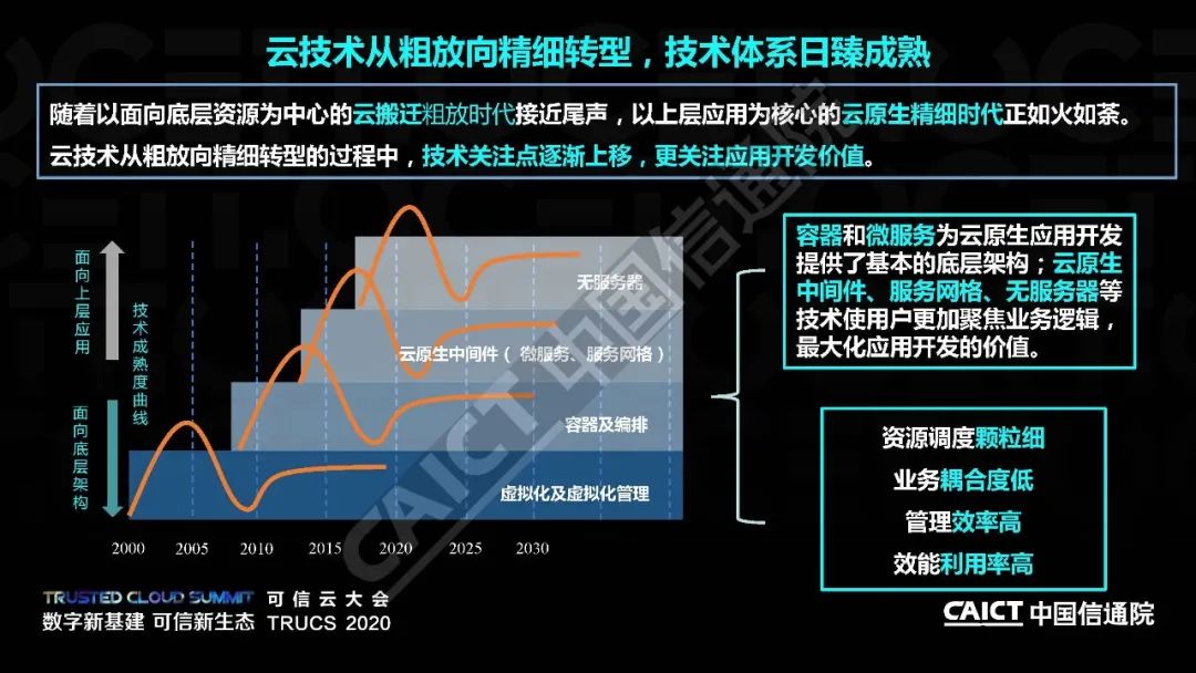 “云技术从粗放向精细转型,技术体系日臻成熟。”栗蔚指出,随着云原生的容器、微服务、无服务器等技术,越来越靠近应用层,资源调度的颗粒性、业务耦合性、管理效率和效能利用率都得到了极大提高。