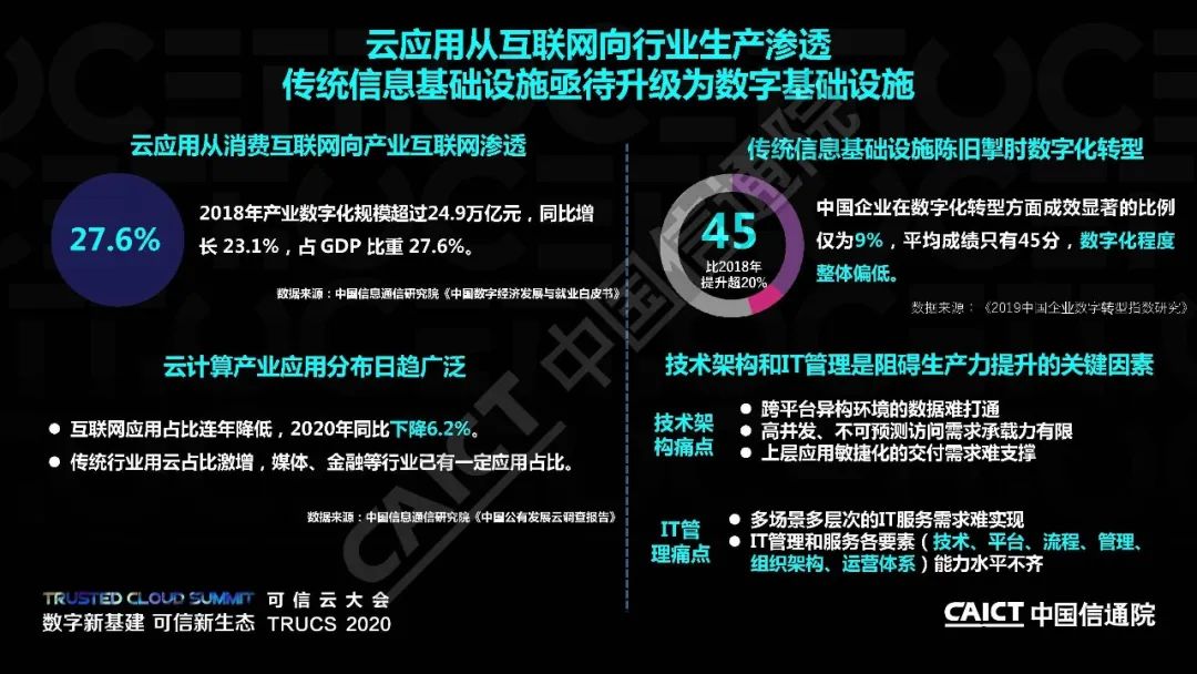 “数字化转型推动云应用从互联网向行业生产渗透,传统信息基础设施亟待升级为数字基础设施。”栗蔚介绍,中国信通院调研显示,云应用日趋广泛,并且正在从消费互联网向产业互联网渗透。