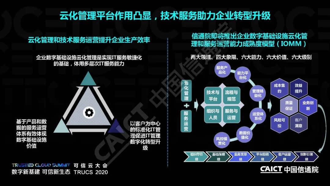 为了应对上述痛点,目前业界加速推进企业技术架构迭代升级,促进传统数字化转型。同时,云化管理平台的作用也日渐凸显。栗蔚介绍,在这一背景下,中国信通院即将推出企业数字基础设施云化管理和服务运营能力成熟度模型(IOMM),从服务产品化、能力平台化、管理精益化、运营体系化、数据价值化等六个方面,为企业数字化转型的数字基础设施能力“把脉”。