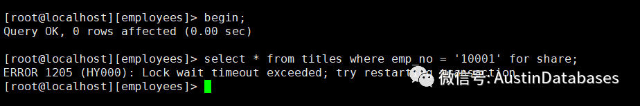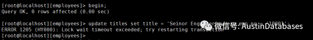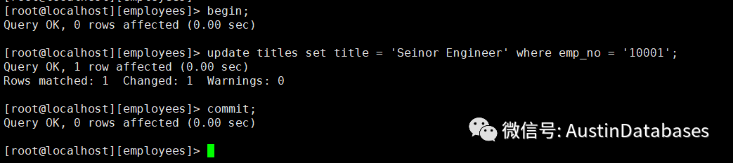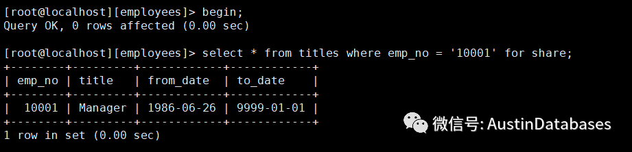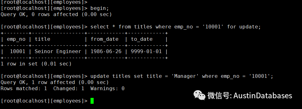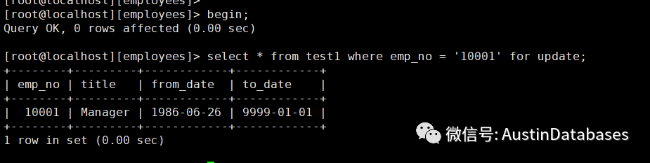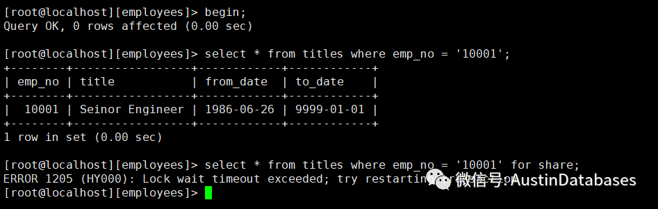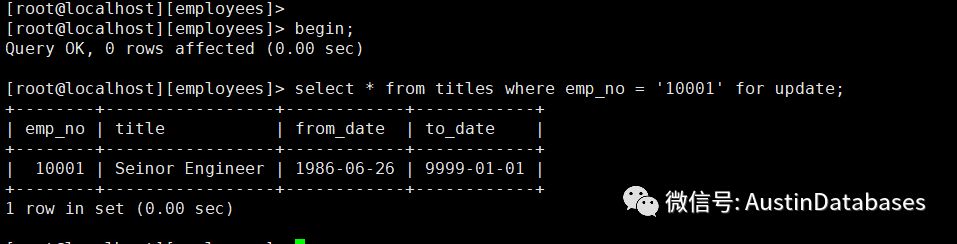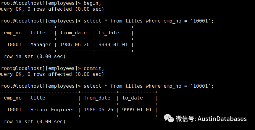 我们可以看到在事务1 运行过程中, 事务2 已经将查看的员工信息的title 进行了更改.