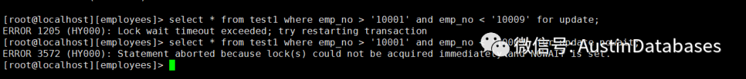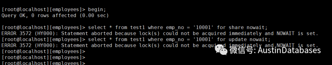 MYSQL 数据库本身的定位是快速的OLTP的操作,在高并发中这样的等待的情况可能不被允许,应用程序希望快速的得到我是否可以对这行是否能进行操作,所以在此基础上,MYSQL 8 提供了 NOWAIT 的方式来满足应用的需求.