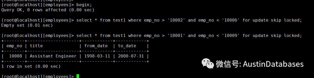可以从图2中看到,如果此时想对已经部分被锁定 部分未被锁定的数据 查询时使用了 for update skip locked 则是可以查到在集合内并未被锁定的数据.
