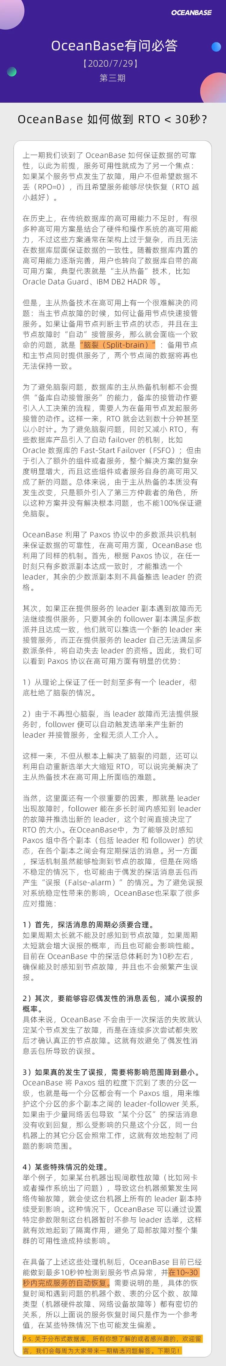 OB君:“OB有问必答”是OceanBase最新上线的互动类栏目,每周围绕一个关于分布式数据库的议题为大家详细展开解答,今天我们围绕服务可用性话题讨论,如果你有任何感兴趣的问题,欢迎留言,我们会每周选取一个问题为大家详细解答