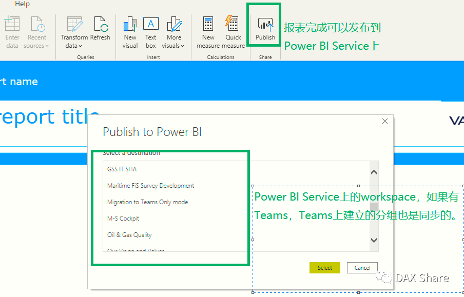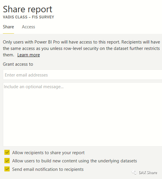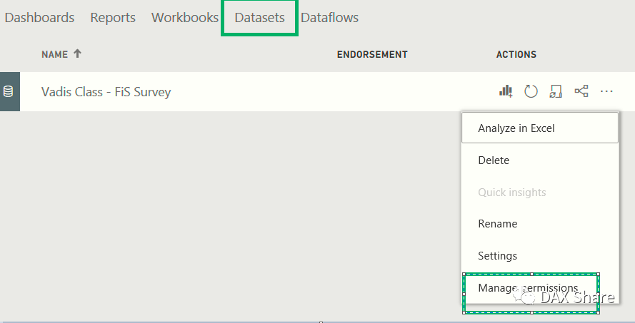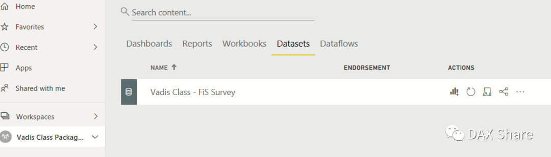 刚刚说了,如果对于选择的datasets所在的workspace没有权限的话,那么基于这个Datasets的新报表是不能被分享的。所以可以专门建立一个workspace设置权限让大家使用。