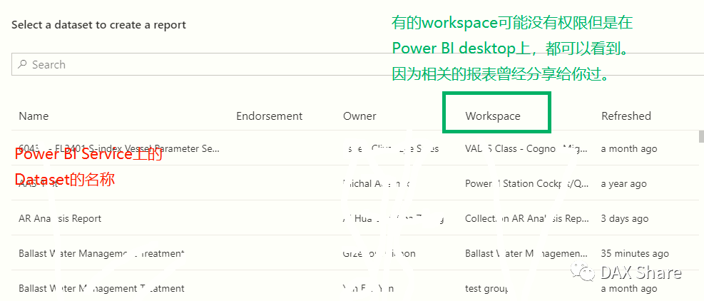 你可以看到所有分享给你过的报表的datasets。不过有些datasets虽然你能看到,但是如果workspace没有给你设置权限,你也是只能在Power BI Desktop上面分析datasets的数据,而不能把报表发布到Power BI Service。