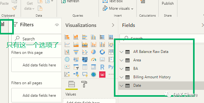 当导入Excel数据源或者SQL数据库数据源或者AAS的数据源之后,会得到一个如下内容。只有一个报表相关页和一个成型的数据模型,不能进行数据的处理,所以不能建立Calculated Column,但是还可以做计算measures。这个其实对用户来说,更加简单方便。