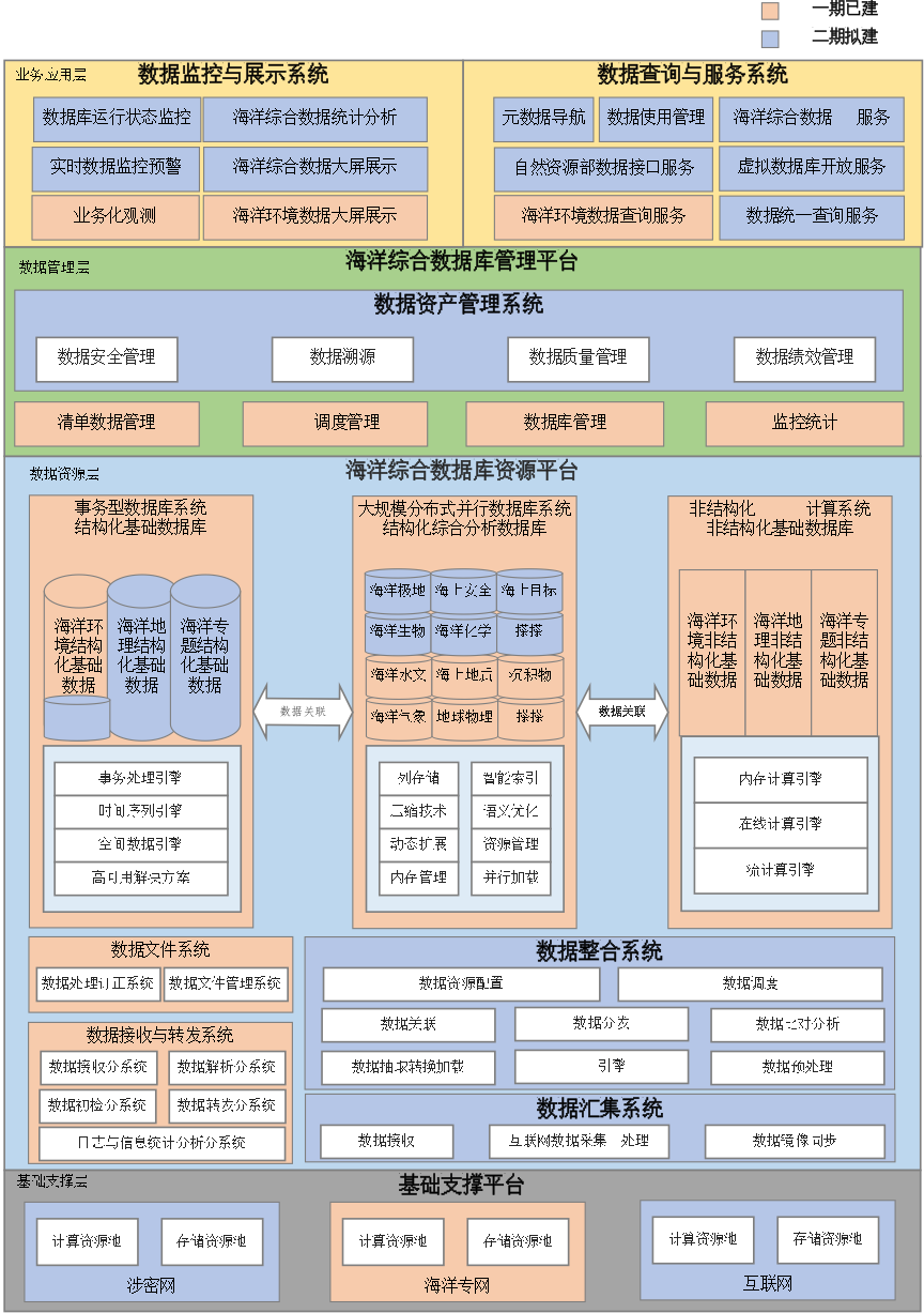 海洋综合数据库(二期)基于一期已建设完成的“多种架构支持多类应用”的海洋环境平台体系架构,采用混搭模式进行设计。