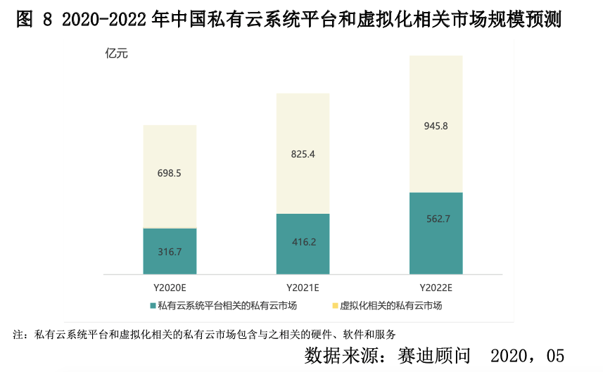 根据赛迪顾问的数据,2019年我国私有云市场规模达到817.4亿元,预计2022年将超过1500亿元,其中政府、金融、电信、交通、教育、制造业、能源、医疗卫生是主要的私有云部署领域。