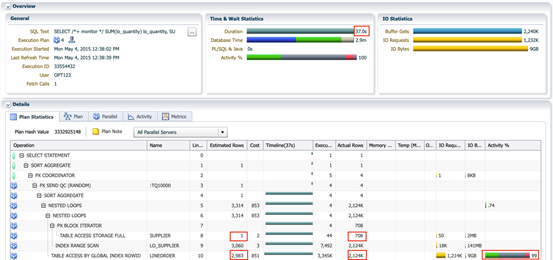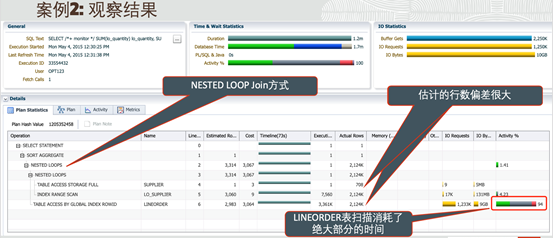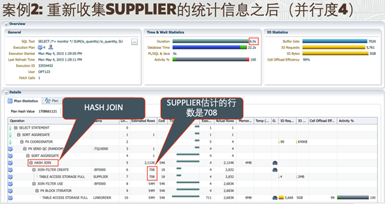 否则,如果你上来一看见访问LINEORDER表的那条Activity%最长,就不管不顾的去收集LINEORDER表的统计信息,收集完了不管用不说,你可是要花很长时间才能知道不管用,因为LINEORDER表是个大表啊,收集统计信息花的时间,肯定比收集SUPPLIER表的统计信息长的多啊。