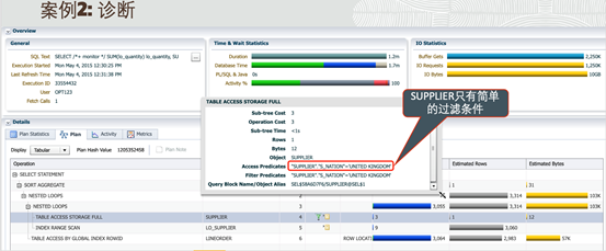 所以问题是,优化器对SUPPLIER表的估计为什么会差了700多倍?读了我们上一期文章的话,肯定马上会想到,检查一下SQL Monitor Report的Plan tab,看看SUPPLIER表上的predicate是什么。