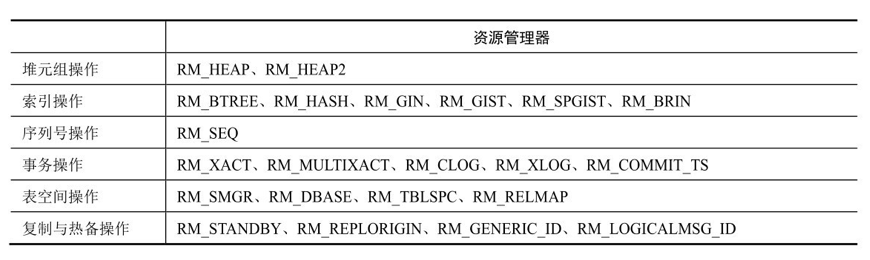 下图展示了在PostgreSQL 10中所包含的资源管理器的类型,共计有22种(在最新的PostgreSQL 12中,资源管理器的类型未增加),涉及到了堆元组操作、索引操作、序列号操作等。