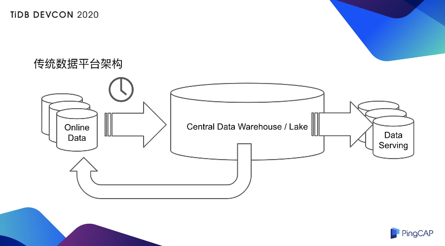 所以大家可以看到 TP 和 AP 对于需求和技术侧其实是非常不一样的。因为这些不同,所以传统的数据架构其实是下图这样子的。