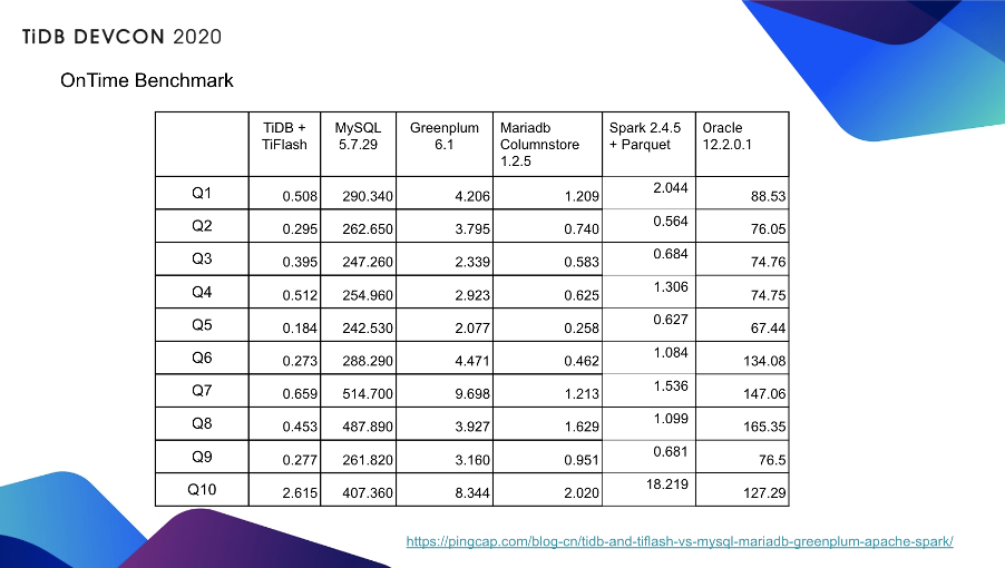 其实之前我们的 blog 上都写过,由上面两个图可见,这套系统的性能是非常不错的。当时是用 TiDB 加上 TiFlash,对比 Mariadb,对比 Spark 以及对比 Greenplum,当然也对比了 Oracle,但是 Oracle 没有开始它的列存。