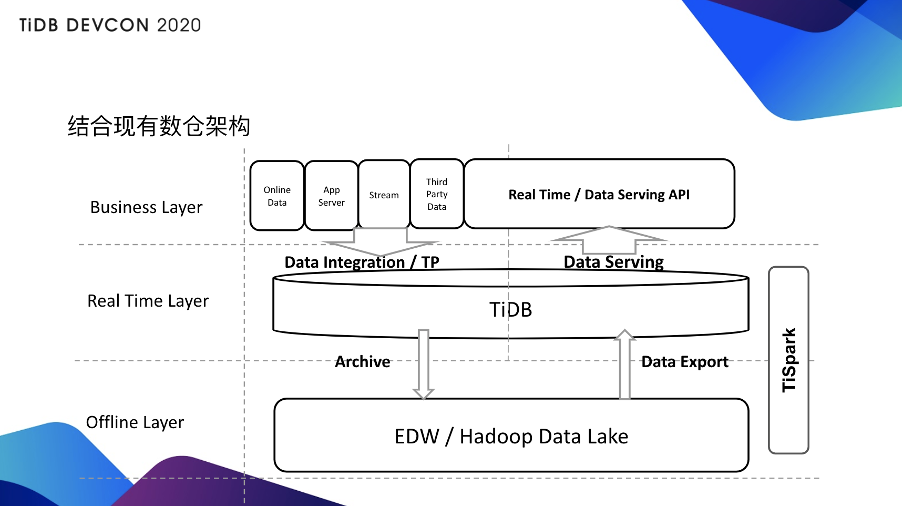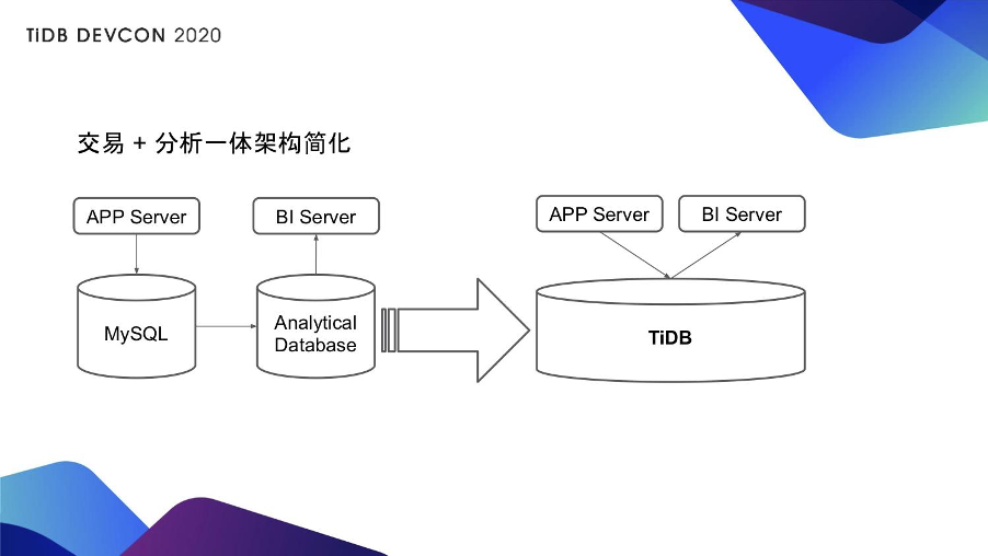 回到前面已经阐述过的观点,在 HTAP 场景底下 TiDB 能为用户提供一个简化架构,降低运维复杂度,更重要的是我们提升业务的实时性,提升业务的敏捷性。