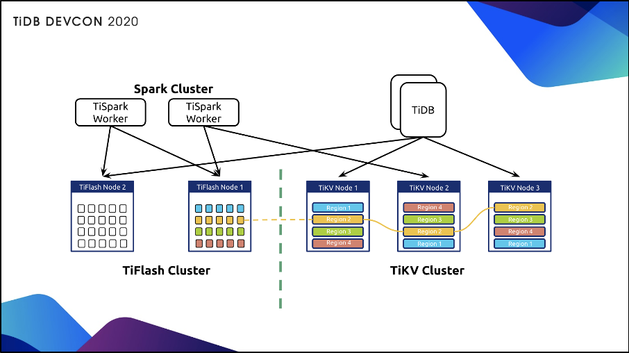 第一个是 TiDB 的 TiFlash 架构下还是使用 Mutli-Raft 的,也就是说 TiFlash 复制数据和存储数据的单元,比如说是以 region 为单元存储,这些和 TiKV 还是保持一致的,但是它是从一个行存到列存的复制。