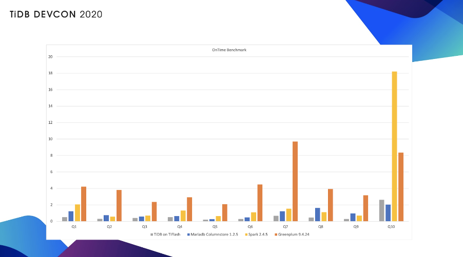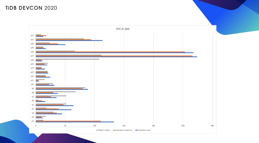 上图是 TiSpark 加 TiFlash 对比 Greenplum 的性能,大家可以看到基本上是处于同一个量级,就是有一些 Greenplum 会更快一些,有一些 TiSpark 加 TiFlash 更快一些。