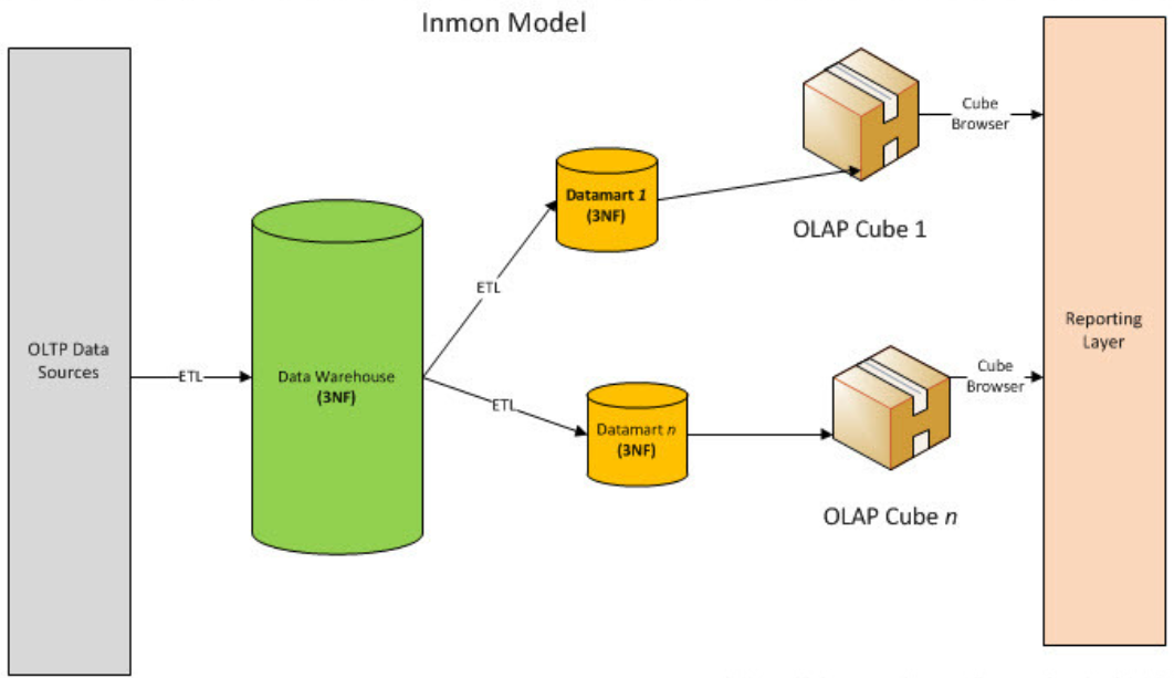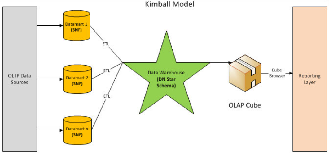 Kimball 模式从流程上看是是自底向上的,即从数据集市到数据仓库再到数据源(先有数据集市再有数据仓库)的一种敏捷开发方法,其是以最终任务为导向的。kimball采用了多维模型–星型模型,并且还是最低粒度的数据存储。先按照业务主线建立最小粒度的事实表,再建立维度表,形成数据集市,方便下一步的BI与决策支持。