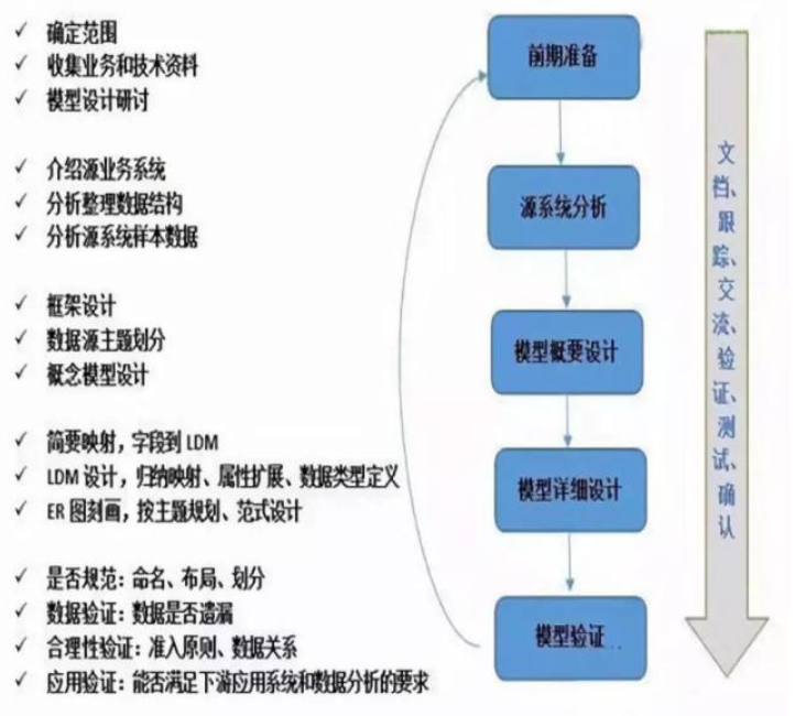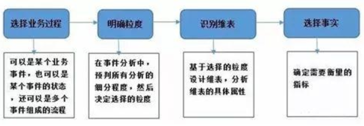 通常需要选择某个业务过程,然后围绕该过程建立模型,其一般采用自底向上的方法,从明确关键业务过程开始,再到明确粒度,再到明确维度,最后明确事实,非常简单易懂。
