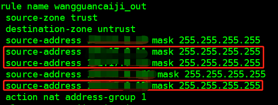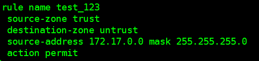至此NAT配置已经完成,接下来建立安全策略,输入security-policy进入安全策略配置界面,允许源地址172.17.0.0/24访问所有外网IP,具体配置如下图所示:
