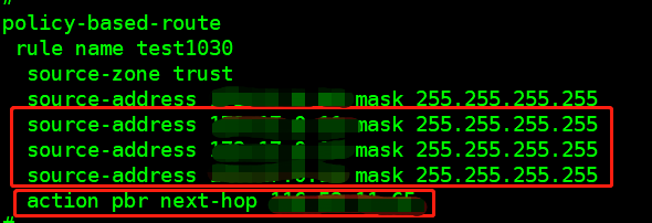 针对此问题进行策略路由配置,配置源地址172.17.0.11/12/13,目的地址为所有,下一跳地址为x.x.x.x,也就是说使172.17.0.11/12/13三台主机通过电信链路访问外网(x.x.x.x为电信IP),至此主机可成功访问外网,配置完成,策略路由配置如下图所示: