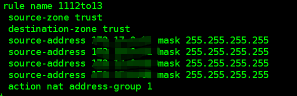 输入nat-policy,进入nat规则配置视图进行配置,源域为trust,目的域为untrust,源地址为172.17.0.11/12/13,目的地址为所有(默认为所有),action为转换为address-group1,也就是x.x.x.x,也就是说将trust域的源地址172.17.0.11/12/13转换成x.x.x.x用于访问untrust域的所有地址(所有外网IP),配置如下图所示:
