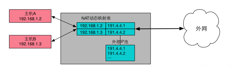 动态地址NAT(PooledNAT)(多对多):将内部网络的私有IP地址转换为公用IP地址时,IP地址是不确定,随机的。所有被授权访问Internet的私有IP地址可随机转换为任何指定合法的IP地址。动态NAT是在路由器上配置一个外网IP地址池,当内部有计算机需要和外部通信时,就从地址池里动态的取出一个外网IP,并将他们的对应关系绑定到NAT表中,通信结束后,这个外网IP才被释放,可供其他内部IP地址转换使用。