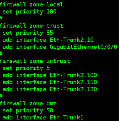 针对此需求首先查看防火墙安全区域划分,从配置上可以看出主要分为local、trust、untrust、dmz四个安全区域,安全级别最高为local,最低为untrust,同样可以从配置上看出各安全域所包含的接口,配置如下图所示: