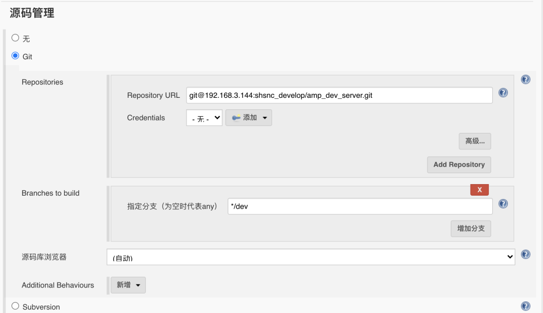 填写git地址信息,由于已配置ssh,无需配置认证凭据
