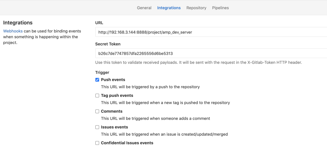 同时需要在Gitlab的Webhooks中配置上图圈出的地址,勾上Pushevents触发