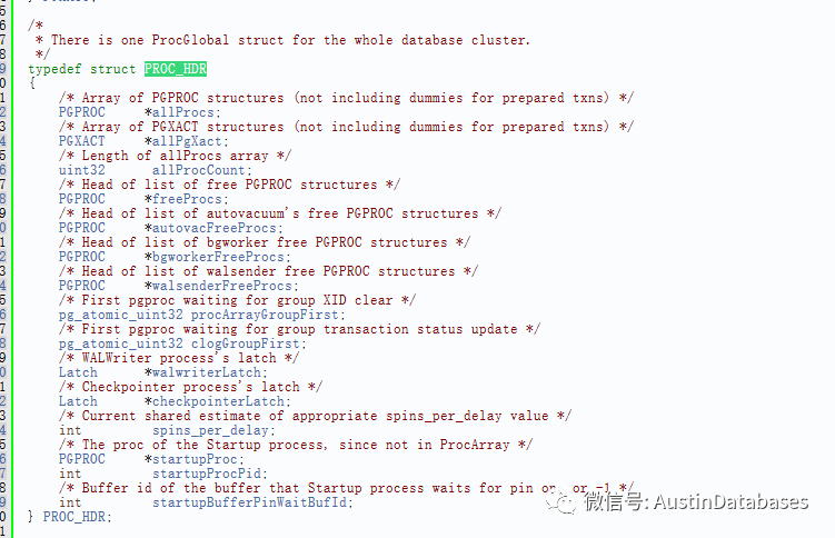 这个PGPROC 会在 PROC_HDR中被调用, allProcs 是一个指针,也就是所有的PGPROC 都会在这里面.PGPROC 主要的作用是要在事务处理期间处理相关例如等待和处理等工作之间的切换,PROC 主要的作用进程间协同和通讯以及postmaster的跟踪