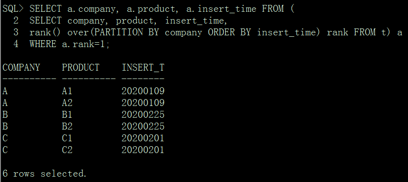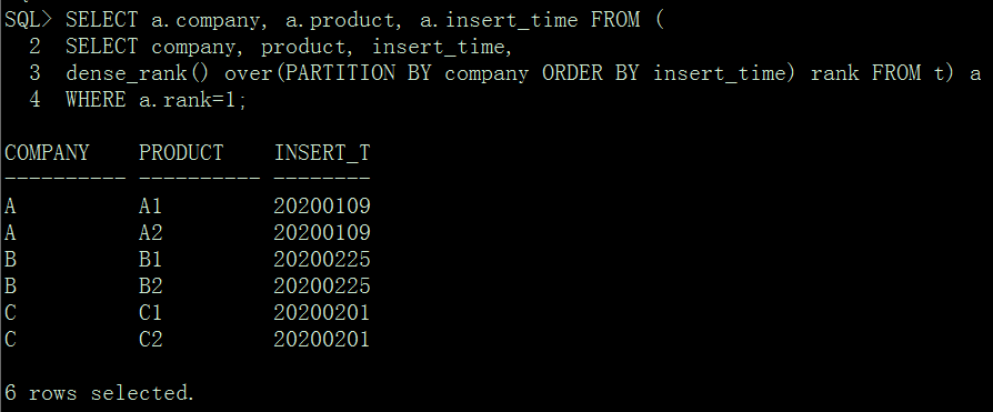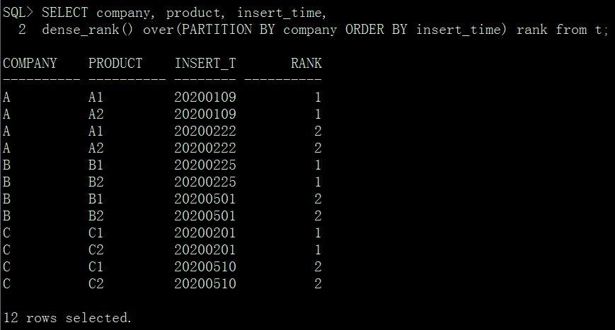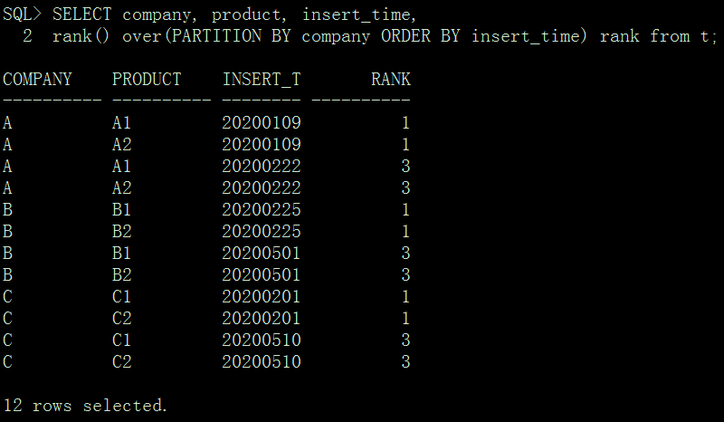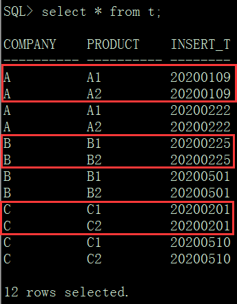 SQL> select * from t;COMPANY PRODUCT INSERT_T---------- ---------- --------A A1 20200109A A2 20200109A A1 20200222A A2 20200222B B1 20200225B B2 20200225B B1 20200501B B2 20200501C C1 20200201C C2 20200201C C1 20200510C C2 2020051012 rows selected.