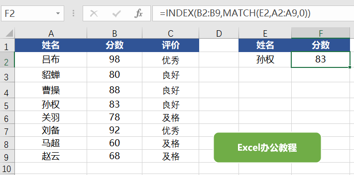 =INDEX(B2:B9,MATCH(E2,A2:A9,0))INDEX函数主要是用来返回给定范围内行列交叉处的值。INDEX函数的方法比较灵活,可以返回某行或者某列或者具体的某个单元格,具体语法如下:=INDEX(数组范围, 返回某行, [返回某列])选择数组中的某行,函数从该行返回数值。如果省略行, 则需要列。MATCH函数则主要是给出指定值在指定范围内的所在位置。=MATCH(查找的内容, 查找的范围, [查找类型])- 1表示MATCH 函数会查找小于或等于 lookup_value 的最大值