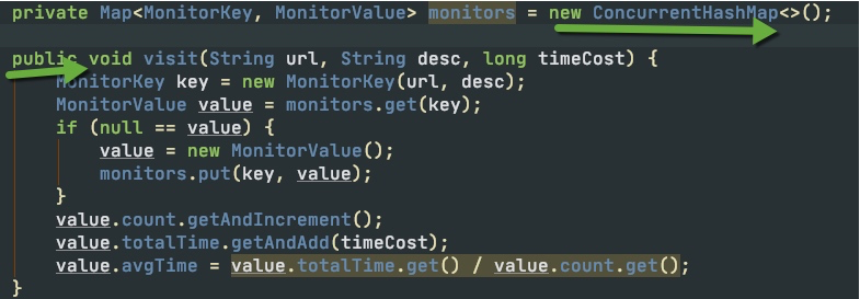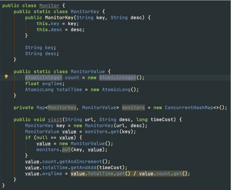 MonitorKey key = new MonitorKey(url, desc);MonitorValue value = monitors.putIfAbsent(key, new MonitorValue());value.count.getAndIncrement();value.totalTime.getAndAdd(timeCost);value.avgTime = value.totalTime.get() / value.count.get();
