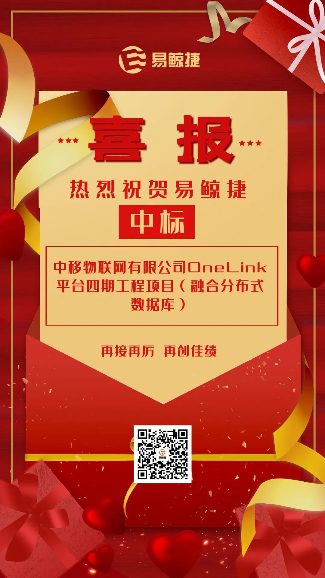 近日,贵州易鲸捷信息技术有限公司独家中标中移物联网有限公司OneLink平台四期工程项目(融合分布式数据库)。