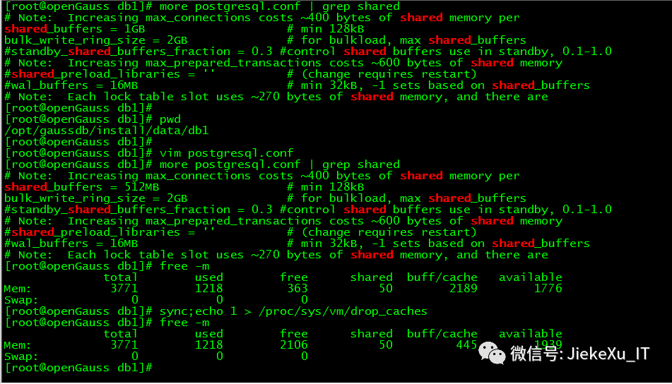 [omm@openGauss ~]$ gs_om -t startStarting cluster.=========================================[GAUSS-53600]: Can not start the database, the cmd is source home/omm/.bashrc; python3 '/opt/gaussdb/install/om/script/local/StartInstance.py' -U omm -R opt/gaussdb/install/app -t 300 --security-mode=off, Error:[FAILURE] openGauss:[GAUSS-51607] : Failed to start instance. Error: Please check the gs_ctl log for failure details..####————> gs_ctl 启动显示更多详细信息[omm@openGauss ~]$ gs_ctl start -D opt/gaussdb/install/data/db1[2020-07-12 00:16:01.408][65296][][gs_ctl]: gs_ctl started,datadir is -D "/opt/gaussdb/install/data/db1"[2020-07-12 00:16:01.535][65296][][gs_ctl]: waiting for server to start....0 [BACKEND] LOG: Begin to start openGauss Database.2020-07-12 00:16:01.850 5f09e5c1.1 [unknown] 140308361469696 [unknown] 0 dn_6001 DB001 0 [REDO] LOG: Recovery parallelism, cpu count = 4, max = 4, actual = 42020-07-12 00:16:01.850 5f09e5c1.1 [unknown] 140308361469696 [unknown] 0 dn_6001 DB001 0 [REDO] LOG: ConfigRecoveryParallelism, true_max_recovery_parallelism:4, max_recovery_parallelism:42020-07-12 00:16:01.850 5f09e5c1.1 [unknown] 140308361469696 [unknown] 0 dn_6001 00000 0 [BACKEND] LOG: gaussdb.state does not exist, and skipt setting since it is optional.2020-07-12 00:16:01.850 5f09e5c1.1 [unknown] 140308361469696 [unknown] 0 dn_6001 00000 0 [BACKEND] LOG: Transparent encryption disabled.2020-07-12 00:16:01.890 5f09e5c1.1 [unknown] 140308361469696 [unknown] 0 dn_6001 01000 0 [BACKEND] WARNING: could not create any HA TCP/IP sockets2020-07-12 00:16:01.898 5f09e5c1.1 [unknown] 140308361469696 [unknown] 0 dn_6001 00000 0 [BACKEND] LOG: InitNuma numaNodeNum: 1 numa_distribute_mode: none inheritThreadPool: 0.2020-07-12 00:16:01.899 5f09e5c1.1 [unknown] 140308361469696 [unknown] 0 dn_6001 01000 0 [BACKEND] WARNING: Failed to initialize the memory protect for g_instance.attr.attr_storage.cstore_buffers (1024 Mbytes) or shared memory (4213 Mbytes) is larger.2020-07-12 00:16:01.899 5f09e5c1.1 [unknown] 140308361469696 [unknown] 0 dn_6001 42809 0 [BACKEND] FATAL: could not create shared memory segment: Cannot allocate memory2020-07-12 00:16:01.899 5f09e5c1.1 [unknown] 140308361469696 [unknown] 0 dn_6001 42809 0 [BACKEND] DETAIL: Failed system call was shmget(key=26000001, size=4418076672, 03600).2020-07-12 00:16:01.899 5f09e5c1.1 [unknown] 140308361469696 [unknown] 0 dn_6001 42809 0 [BACKEND] HINT: This error usually means that PostgreSQL's request for a shared memory segment exceeded available memory or swap space, or exceeded your kernel's SHMALL parameter. You can either reduce the request size or reconfigure the kernel with larger SHMALL. To reduce the request size (currently 4418076672 bytes), reduce PostgreSQL's shared memory usage, perhaps by reducing shared_buffers.The PostgreSQL documentation contains more information about shared memory configuration.2020-07-12 00:16:01.916 5f09e5c1.1 [unknown] 140308361469696 [unknown] 0 dn_6001 00000 0 [BACKEND] LOG: FiniNuma allocIndex: 0.[2020-07-12 00:16:02.537][65296][][gs_ctl]: waitpid 65306 failed, exitstatus is 256, ret is 2[2020-07-12 00:16:02.538][65296][][gs_ctl]: stopped waiting[2020-07-12 00:16:02.538][65296][][gs_ctl]: could not start server[2020-07-12 00:16:02.538][65296][][gs_ctl]: Examine the log output.[omm@openGauss ~]$####——> 修改 pg 配置文件 postgresql.conf 关于 shared_buffers 的值[root@openGauss db1]# cd opt/gaussdb/install/data/db1[root@openGauss db1]# more postgresql.conf | grep shared# Note: Increasing max_connections costs ~400 bytes of shared memory pershared_buffers = 1GB # min 128kBbulk_write_ring_size = 2GB # for bulkload, max shared_buffers#standby_shared_buffers_fraction = 0.3 #control shared buffers use in standby, 0.1-1.0# Note: Increasing max_prepared_transactions costs ~600 bytes of shared memory#shared_preload_libraries = '' # (change requires restart)#wal_buffers = 16MB # min 32kB, -1 sets based on shared_buffers# Note: Each lock table slot uses ~270 bytes of shared memory, and there are[root@openGauss db1]#[root@openGauss db1]# pwd/opt/gaussdb/install/data/db1[root@openGauss db1]#[root@openGauss db1]# vim postgresql.conf[root@openGauss db1]# more postgresql.conf | grep shared# Note: Increasing max_connections costs ~400 bytes of shared memory pershared_buffers = 512MB # min 128kBbulk_write_ring_size = 2GB # for bulkload, max shared_buffers#standby_shared_buffers_fraction = 0.3 #control shared buffers use in standby, 0.1-1.0# Note: Increasing max_prepared_transactions costs ~600 bytes of shared memory#shared_preload_libraries = '' # (change requires restart)#wal_buffers = 16MB # min 32kB, -1 sets based on shared_buffers# Note: Each lock table slot uses ~270 bytes of shared memory, and there are