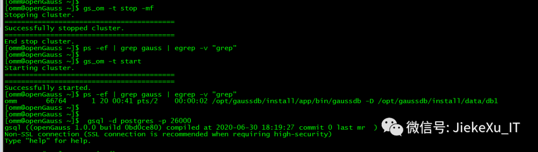 [omm@openGauss ~]$ gs_om -t stop -mfStopping cluster.=========================================Successfully stopped cluster.=========================================End stop cluster.[omm@openGauss ~]$ ps -ef | grep gauss | egrep -v "grep"[omm@openGauss ~]$[omm@openGauss ~]$ gs_om -t startStarting cluster.==================================================================================Successfully started.[omm@openGauss ~]$ ps -ef | grep gauss | egrep -v "grep"omm 66764 1 20 00:41 pts/2 00:00:02 opt/gaussdb/install/app/bin/gaussdb -D opt/gaussdb/install/data/db1[omm@openGauss ~]$ gsql -d postgres -p 26000gsql ((openGauss 1.0.0 build 0bd0ce80) compiled at 2020-06-30 18:19:27 commit 0 last mr )Non-SSL connection (SSL connection is recommended when requiring high-security)Type "help" for help.--使用 “gs_om -t status –detail” 命令查询 openGauss 各实例情况。[omm@openGauss ~]$ gs_om -t status --detail[ Cluster State ]cluster_state : Normalredistributing : Nocurrent_az : AZ_ALL[ Datanode State ]node node_ip instance state---------------------------------------------------------------------------------------1 openGauss 192.168.52.88 6001 opt/gaussdb/install/data/db1 P Primary Normal