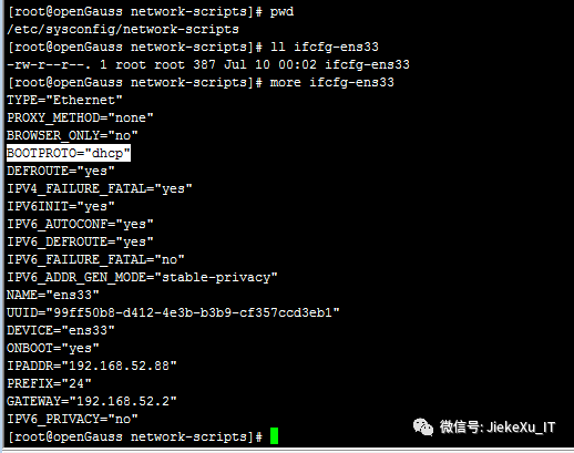 [root@openGauss opt]# ifconfigens33: flags=4163<UP,BROADCAST,RUNNING,MULTICAST> mtu 8192inet 192.168.52.28 netmask 255.255.255.0 broadcast 192.168.52.255[root@openGauss network-scripts]# cd /etc/sysconfig/network-scripts[root@openGauss network-scripts]# more ifcfg-ens33 | grep nonePROXY_METHOD="none"BOOTPROTO="none"[root@openGauss network-scripts]# service network restartRestarting network (via systemctl): [ OK ][root@openGauss network-scripts]#[root@openGauss network-scripts]#[root@openGauss network-scripts]# ifconfigens33: flags=4163<UP,BROADCAST,RUNNING,MULTICAST> mtu 8192inet 192.168.52.88 netmask 255.255.255.0 broadcast 192.168.52.255--------------------------------------------------------------------------------[root@openGauss script]# pwd/opt/openGauss/script[root@openGauss script]# ./gs_preinstall -U omm -G dbgrp -X /opt/openGauss/clusterconfig.xmlParsing the configuration file.Successfully parsed the configuration file.Installing the tools on the local node.Successfully installed the tools on the local node.Are you sure you want to create trust for root (yes/no)? yesPlease enter password for root.Password:Creating SSH trust for the root permission user.Checking network information.All nodes in the network are Normal.Successfully checked network information.Creating SSH trust.Creating the local key file.Successfully created the local key files.Appending local ID to authorized_keys.Successfully appended local ID to authorized_keys.Updating the known_hosts file.Successfully updated the known_hosts file.Appending authorized_key on the remote node.Successfully appended authorized_key on all remote node.Checking common authentication file content.Successfully checked common authentication content.Distributing SSH trust file to all node.Successfully distributed SSH trust file to all node.Verifying SSH trust on all hosts.Successfully verified SSH trust on all hosts.Successfully created SSH trust.Successfully created SSH trust for the root permission user.Setting pssh pathSuccessfully set core path.Distributing package.Begin to distribute package to tool path.Successfully distribute package to tool path.Begin to distribute package to package path.Successfully distribute package to package path.Successfully distributed package.Are you sure you want to create the user[omm] and create trust for it (yes/no)? yesPreparing SSH service.Successfully prepared SSH service.Installing the tools in the cluster.Successfully installed the tools in the cluster.Checking hostname mapping.Successfully checked hostname mapping.Creating SSH trust for [omm] user.Please enter password for current user[omm].Password:Checking network information.All nodes in the network are Normal.Successfully checked network information.Creating SSH trust.Creating the local key file.Successfully created the local key files.Appending local ID to authorized_keys.Successfully appended local ID to authorized_keys.Updating the known_hosts file.Successfully updated the known_hosts file.Appending authorized_key on the remote node.Successfully appended authorized_key on all remote node.Checking common authentication file content.Successfully checked common authentication content.Distributing SSH trust file to all node.Successfully distributed SSH trust file to all node.Verifying SSH trust on all hosts.Successfully verified SSH trust on all hosts.Successfully created SSH trust.Successfully created SSH trust for [omm] user.Checking OS software.Successfully check os software.Checking OS version.Successfully checked OS version.Creating cluster's path.Successfully created cluster's path.Setting SCTP service.Successfully set SCTP service.Set and check OS parameter.Setting OS parameters.Successfully set OS parameters.Warning: Installation environment contains some warning messages.Please get more details by "/opt/openGauss/script/gs_checkos -i A -h openGauss --detail".Set and check OS parameter completed.Preparing CRON service.Successfully prepared CRON service.Setting user environmental variables.Successfully set user environmental variables.Setting the dynamic link library.Successfully set the dynamic link library.Setting Core fileSuccessfully set core path.Setting pssh pathSuccessfully set pssh path.Set ARM Optimization.No need to set ARM Optimization.Fixing server package owner.Setting finish flag.Successfully set finish flag.Preinstallation succeeded.