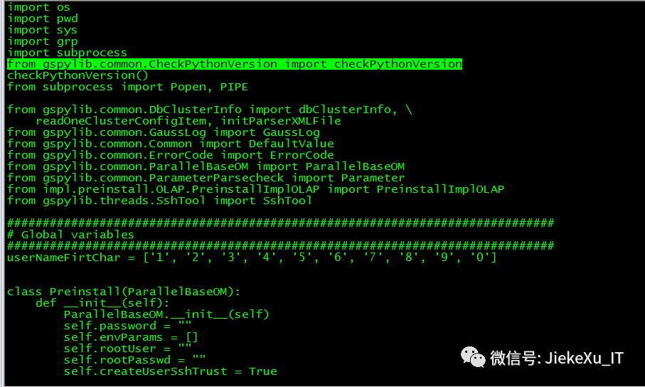gs_preinstall 为 Python 脚本,查看脚本内容为集群环境配置脚本 “environment for a cluster”,会设置 root 用户互信然后新建 omm 用户 dbgrp 组并配置互信,检查操作系统版本,创建路径,设置系统参数,配置环境变量 /etc/profile 以及 omm 用户的 .bashrc 环境变量 等等。