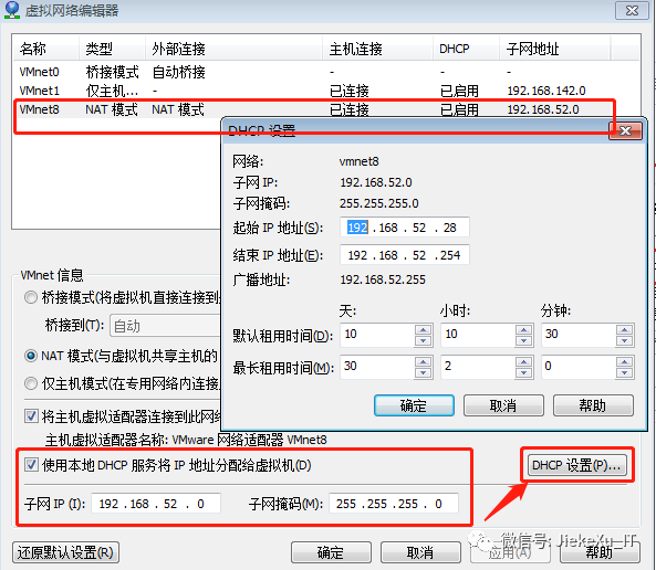然后 VM 里选择【编辑】——>【虚拟网络编辑器】——>【DHCP设置】