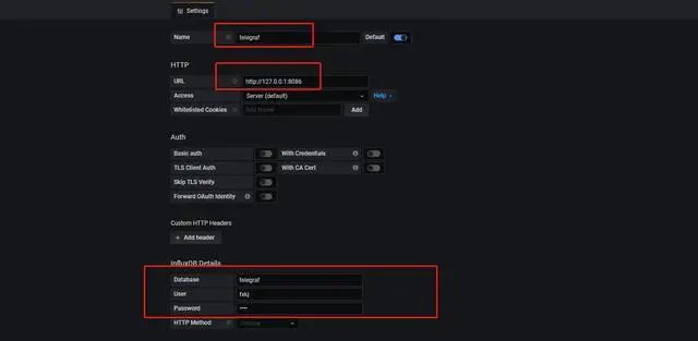 填写数据源 ,Name 名称 (telegraf) , URL 地址 , 数据库名称,用户名,密码