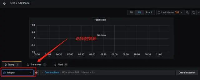 第一步: 选择数据源,选择我们刚刚创建的数据源,名称为teltegraf