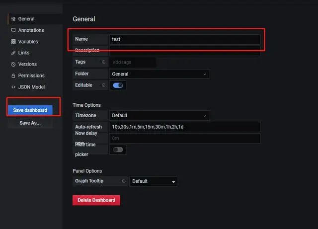 点击 右上角 Dashboard settings 选项, name 名称 命名为 :test