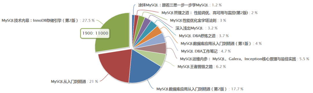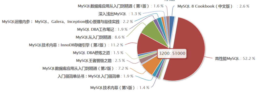 如下是国内原创类MySQL图书的一个评价比例图,从榜单可以看到第2,3名都是入门到精通类图书,这类图书的标题比较占优势,价格很实惠,内容深度上略有不足,评价比例占到了近40%+的比例,对于初学的同学来说,还是重点推荐的。