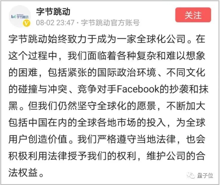 而就在同意剥离美国业务之后,字节跳动昨日深夜发声,表示将继续坚守全球化的愿景,不断加大包括中国在内的全球各地市场的投入,同时还透露他们遭受到了Facebook的抄袭和抹黑。