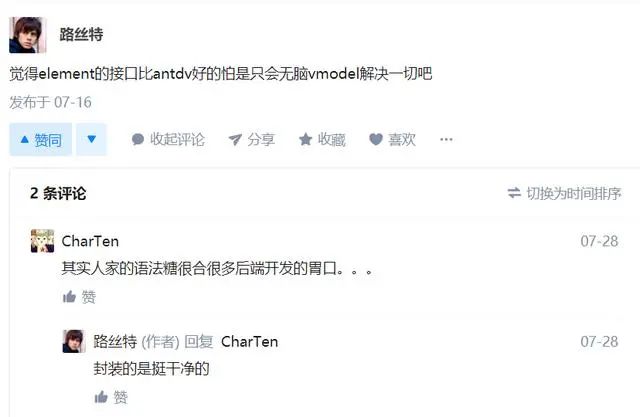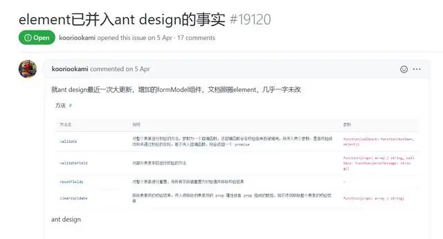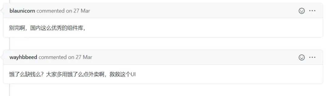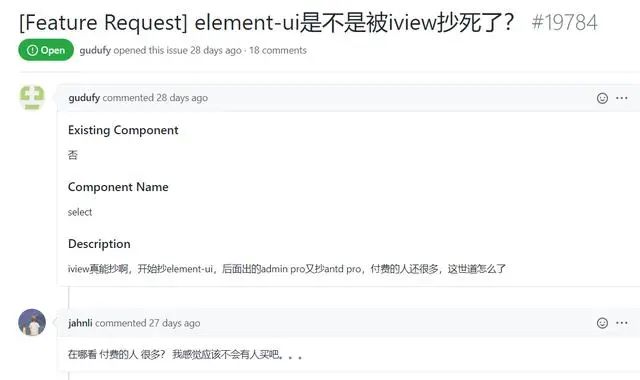 别跟我说Ant Design和iView什么的?前者是相对于React生态圈的,而Vue版本的Ant Design Vue一直都是唐金州个人在主要维护,加上一些社区的中国开发者在维护。你真的不敢保证这个也会是个为了KPI而开源的项目,而且也有网友反应Ant Design Vue代码仓库中有Element代码抄袭的影子,作者反应是为了保证接口跟Element的一致性,这是欲盖弥彰,还是实锤抄袭?而对于后者iView则直接把Element代码拿过来复制黏贴,莫名投来一个鄙视的表情包~~~