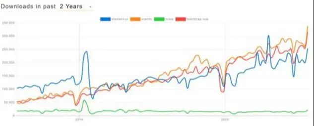element大约在去年年初开始下滑,在此之前的使用率一直碾压其他主流框架